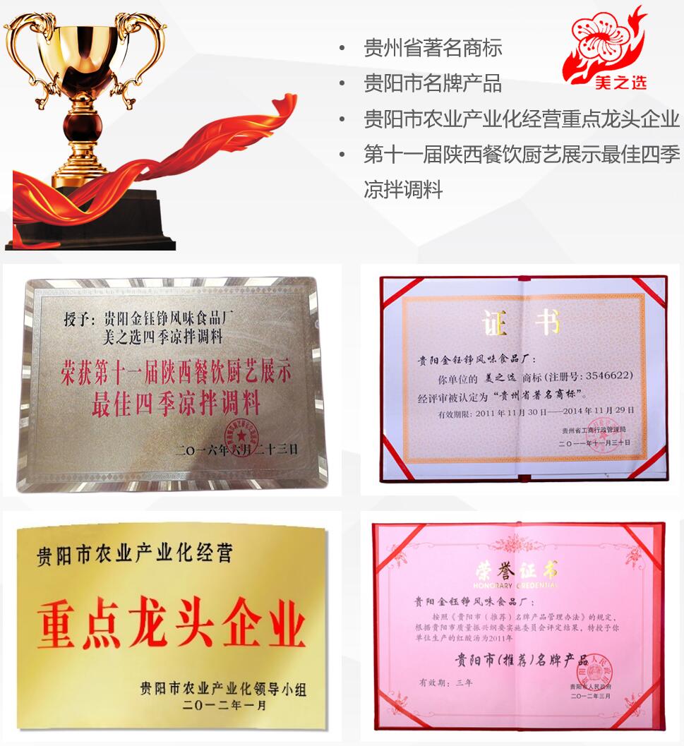 貴州省美之選食品有限公司(貴州省金鈺錚風味食品廠)生產產品2012年榮獲貴陽市推薦名牌產品,并且被貴陽市農業產業化小組評選為重點龍頭企業。